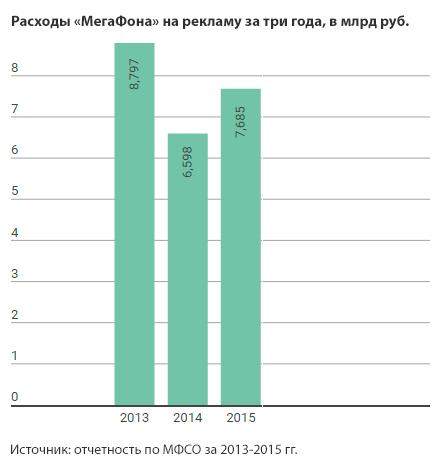 Расходы «МегаФона» на рекламу в 2015 году составили 7,7 млрд руб., что на 16,5% больше, чем в 2014 году – 6,6 млрд руб., говорится в официальном отчете. Чистая прибыль компании увеличилась на 6,3% по сравнению с прошлым годом – 36,7 млрд руб. в 2014 году против 39 млрд руб. в 2015 году. Число абонентов оператора за год выросло на 6,4% за год до 76,8 млн (по состоянию на 31 декабря 2015 года).