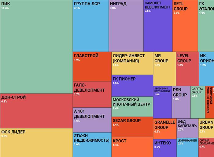 Крупнейший рекламодатель в категории — ГК ПИК. Его расходы составляют 11,3% от всей категории. Доли следующих за ним рекламодателей существенно меньше: у идущего вторым рекламодателя ДОН СТРОЙ — 4,2%, а у занимающей третье место финансово-строительной корпорации «Лидер» (с 2019 г. ГК ФСК) — 3,5%.