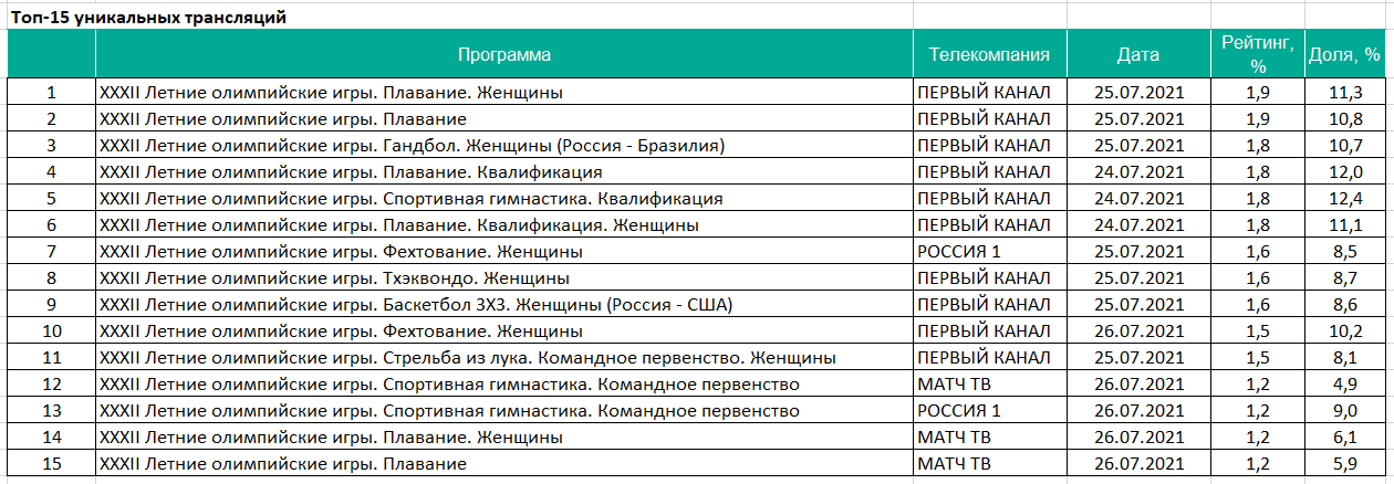 Самый большой интерес в первые три дня Олимпиады у зрителей вызвалоплавание, следует из отчета Mediascope. Соревнования по этому виду спортазаняли шесть строчек в списке 15 самых просматриваемых программ. На первомместе оказались состязания по плаванию среди женщин, которые посмотрели 1,9%россиян и 11,3% от всей телеаудитории. Второе место заняли соревнования средимужчин с рейтингом в 1,9% и долей в 10,8%.