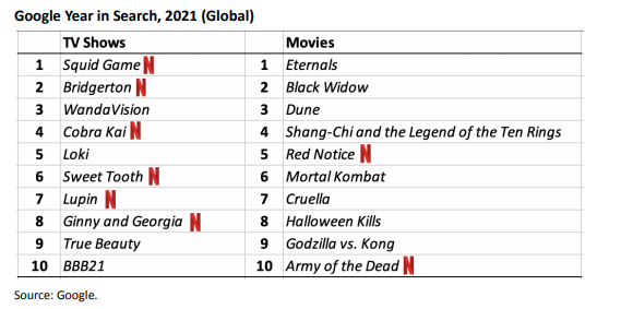 В топе «киношных» запросов Google за 2021 г. оказалось шесть сериалов и дваполнометражных фильма Netflix.