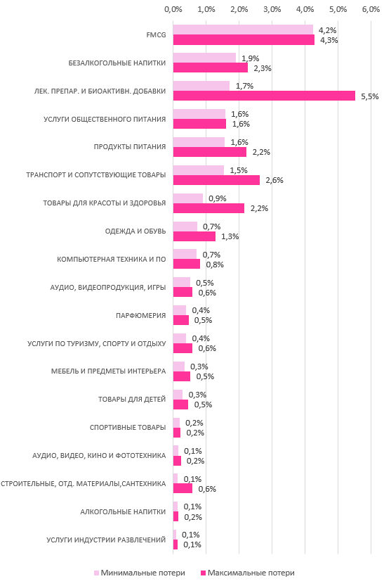 В общем и целом можно выделить шесть категорий, уход компаний изкоторых при оптимистичном развитии ситуации сократит рынок более чем на 1% -это FMCG, безалкогольные напитки, лекарства и БАДы, услуги общепита, продуктыпитания, транспорт/сопутствующие товары. По пессимистичному прогнозу количествотаких категорий вырастет до 8 - прибавятся еще 'Товары для красоты и здоровья'и 'Одежда и обувь'.