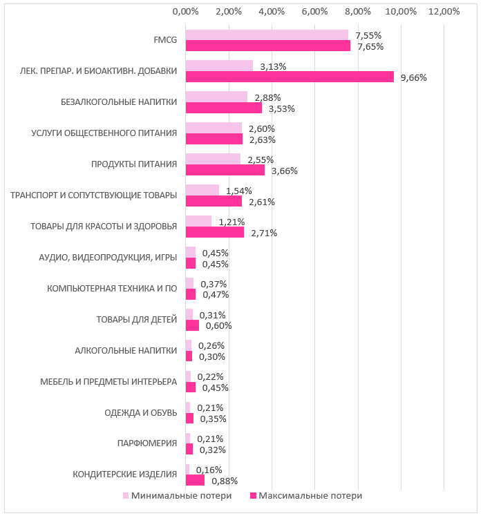 В разных категориях маркетинга компании иностранного происхожденияимеют разные веса. На диаграмме видно, как картина возможных потерь будетвыглядеть в разбивке по отдельным сегментам.