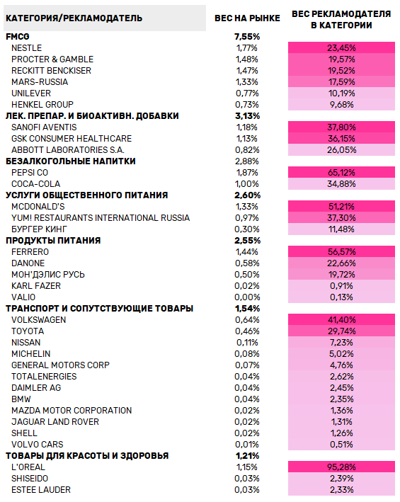 При минимальных возможных потерях наибольший веспотерь (7,55%) в бюджетах ТВ-рекламы у категории FMCG. Драйверами сегментаи, одновременно, ключевыми источниками оттока здесь оказываются такие гигантыкак Nestle (доля 23,5%), Procter&Gamble (19,6%), Reckitt Benckiser (19,5%)и Mars-Russia (17,6%). На втором месте по значимости (3,1%) сегмент лекарств иБАДов, где основными операторами рынка являются Sanofi Aventis (с долей 37,8%),GSK Consumer Healthcare (36,2%) и Abbott Laboratories S.A. (26,0%).