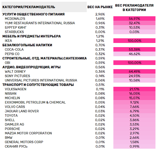 На втором месте по весомости окажется категория мебели и предметовинтерьера (доля 1,21%) со 100%-ным лидером IKEA. Третье местозаймет сегмент безалкогольных напитков, где доли почти поровну поделилиCoca-Cola (53,4%) и Pepsi Co (46,6%).