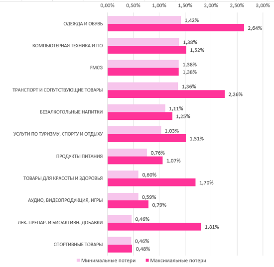 При минимальных возможных потерях наибольшее влияние на уменьшениеобъема рынка окажут компании из сегментов «Одежда и обувь» (доля 1,42%). Здесьнаибольший вес у компаний Asos (21,4%), H&M (19,6%) и Re:trading(19,2%).