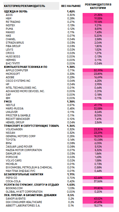 Второе место по значимости (по 1,38%) разделили «Компьютернаятехника и ПО», где основная доля в категории приходится на Apple (50,1%),Microsoft (23,9%) и Adobe (16,7%), и FMCG, где лидируют Nestle с долей 41,2%,Mars-Russia (32,65) и Unilever (8,2%).