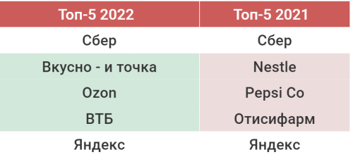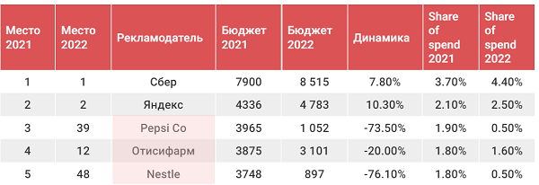Три участника топ-5 2021 г. в прошедшем году резко снизили бюджетына ТВ-рекламу и в итоге покинули пятерку лидеров. По результатам 2022 г.компания Pepsi Co оказалась на 39-м месте, Отисифарм — на 12-м, а Nestleопустилась до 48-й позиции рейтинга.