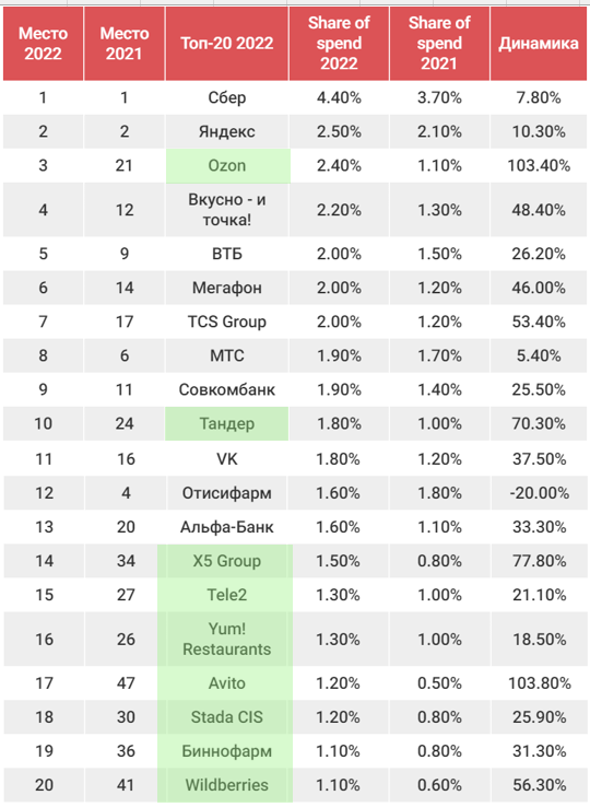 Вместо выбывших из топ-20 участников список пополнился новымикомпаниями. В основном это бренды онлайн- и офлайн- торговли, операторы сотовойсвязи и фармпроизводители. За исключением Ozon и Avito, показавших динамикусвыше 100%, остальные игроки в большей части увеличили бюджеты более скромно. Идаже в случаях значительного увеличения изначальные цифры были не настолькозначительными, чтобы повлиять на общую картину. Тем не менее в совокупности этагруппа новых членов топ-20 смогла несколько компенсировать потери от ушедшихрекламодателей и смягчить падение рынка.