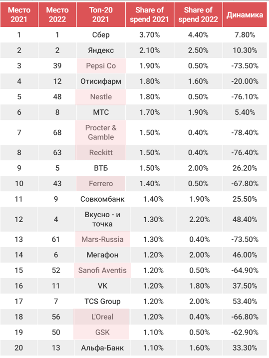 Топ-20 рекламодателей на ТВ в 2021г. и их позиции в 2022-м.