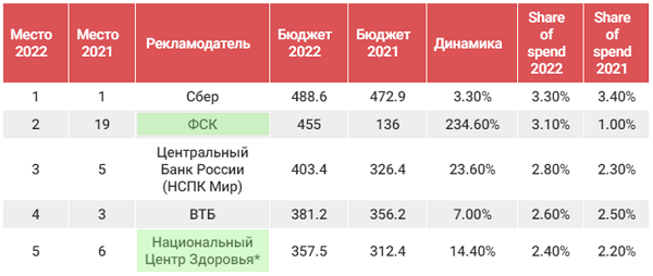 Топ-5 рекламодателей на радио в 2021 г. и их позиции в 2022г.