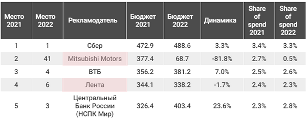 В основном топ-5 рекламодателей на радио остался в прежнемсоставе, хотя есть и изменения. Среди лидеров 2021 г. заметнее всего резкоесокращение (на 81%) рекламного бюджета Mitsubishi Motors, из-за чего компанияпереместилась в 2022 г. со 2-го места на 41-е. Из-за сокращения рекламныхвложений на 1,7% и появления новых игроков с объемными бюджетами потерялпозицию в топ-5 и бренд «Лента», оказавшийся в 2022 г. на шестом месте.