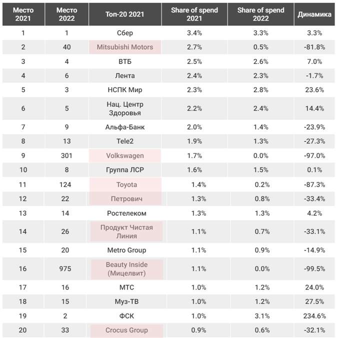 Топ-20 рекламодателей на радио в 2022 г. и их позиции в 2021 г.