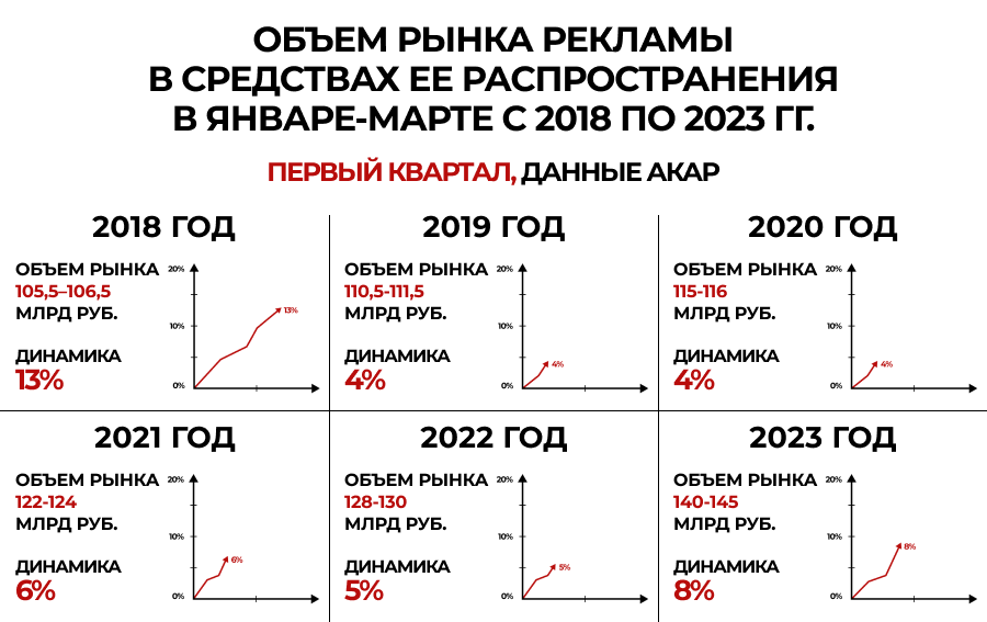 Российский рынок рекламы в январе — марте 2023 г. достиг 140–145 млрд руб.,согласно подсчетам Ассоциации коммуникационных агентств России (АКАР). Год кгоду показатель вырос на 8%. Для сравнения: в первом квартале 2022 г. ростсоставил 5%, в 2021 г. — 6%, в 2020 и 2019 гг. — по 4%.
