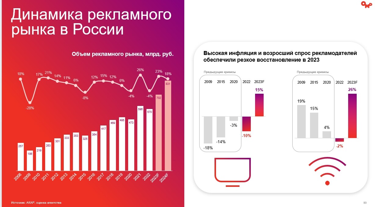 По прогнозам на 2024 г., рост рекламного рынка составит 18% и достигнет 831млрд руб. Ранее Group4Mediaпрогнозировала увеличение рынка на 45% в 2023 г.