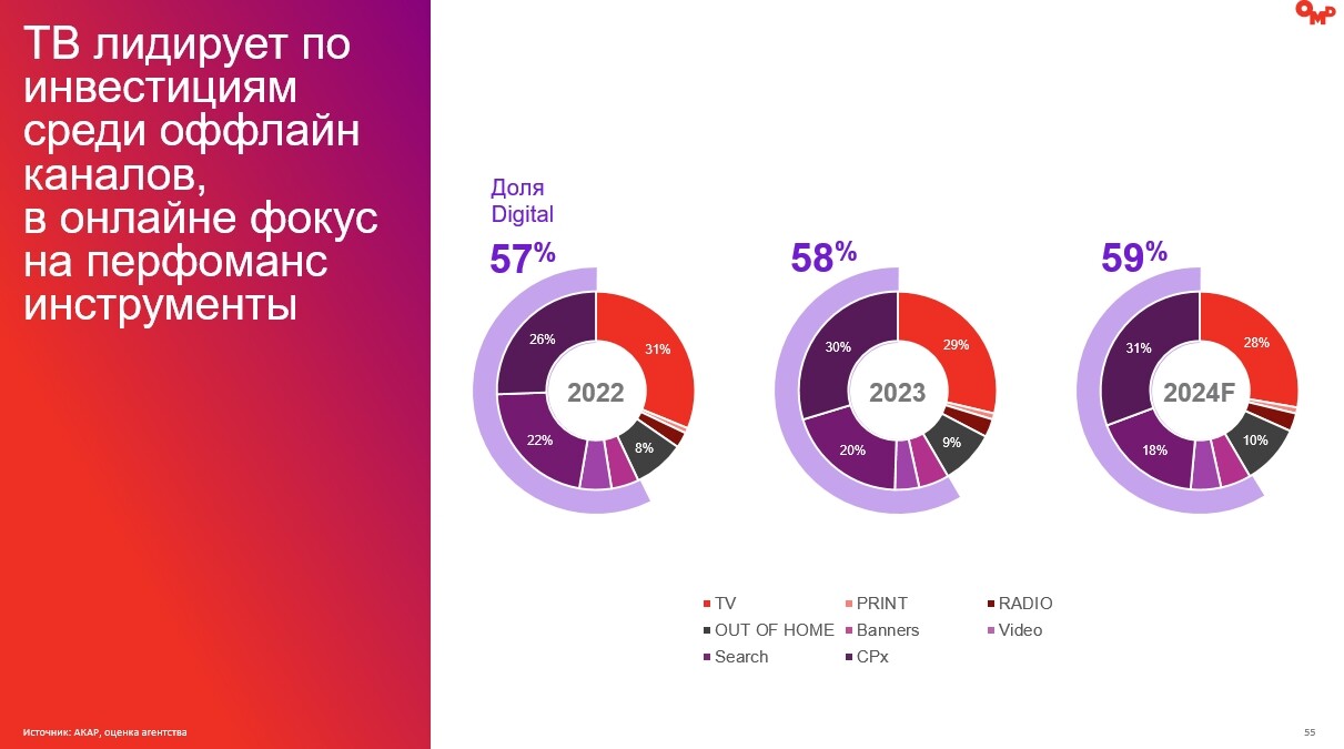 Рекламный рынок в 2023 г. увеличился на 23%. Объем рынка составил 702 млрдруб. По итогам прошлого года бюджеты выросли во всех медиа, кроме прессы. ТВлидирует по инвестициям среди офлайн-каналов, в онлайне рекламодателивкладывают в перформанс-инструменты, согласно отчету OMD OM Group, которыйподготовил Евгений Михайлов, руководитель группы медиаисследований.