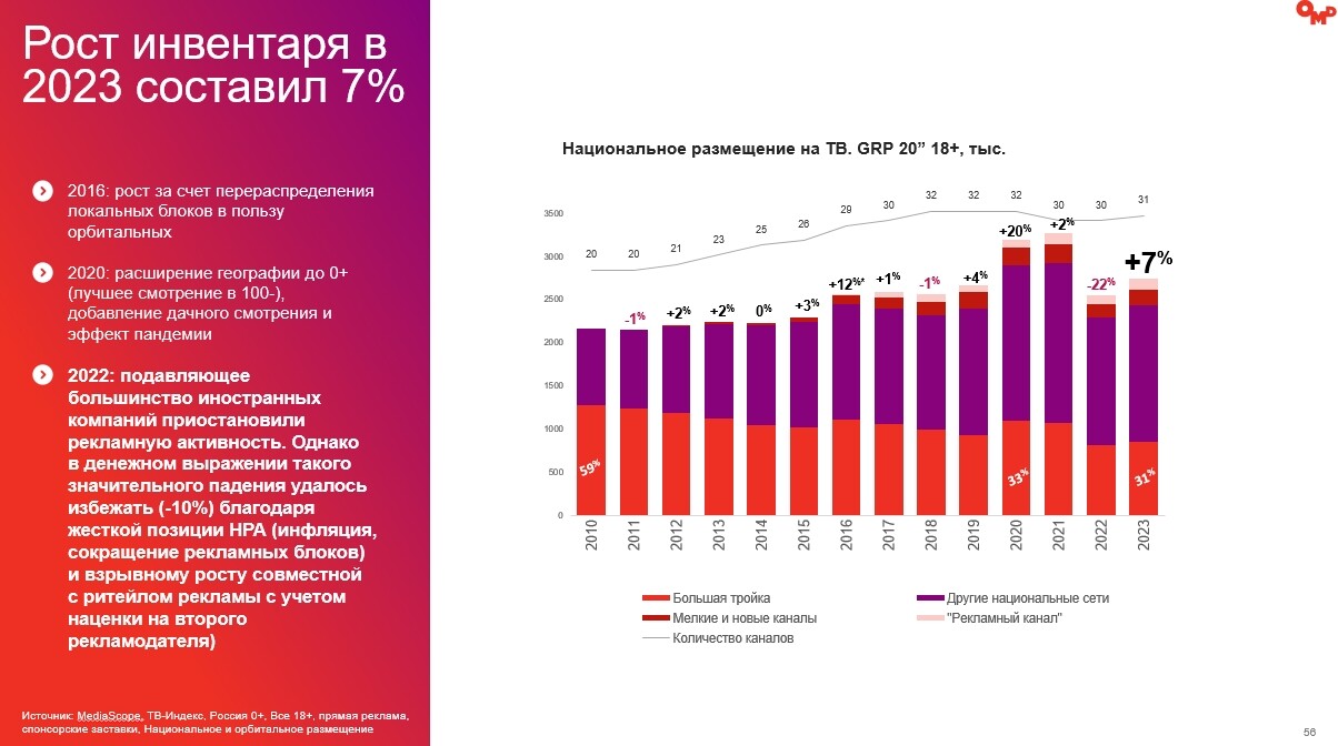 ТВ-инвентаря стало больше на 7%, но показатель не вернулся к уровню 2021 г.На это повлияли «осторожный подход» к выбору контента рекламодателями иснижение смотрения. В OMD ответили, что в 2022 г. подавляющее большинствоиностранных компаний приостановили рекламную активность. Однако в денежномвыражении такого значительного падения удалось избежать (–10%) благодаря«жесткой позиции НРА (инфляция, сокращение рекламных блоков) и взрывному ростусовместной с ретейлом рекламы с учетом наценки на второго рекламодателя)».