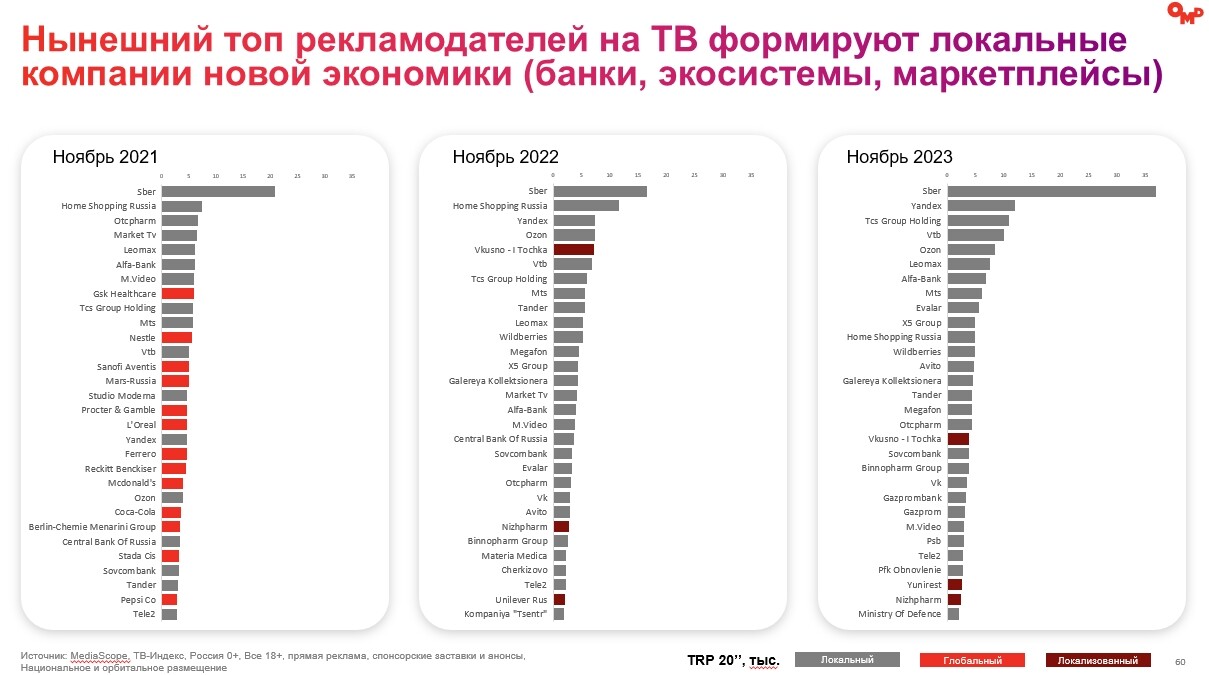 В ноябре 2023 г. в топ рекламодателей на ТВ вошли «Сбер», «Яндекс» и TCSGroup («Тинькофф»).