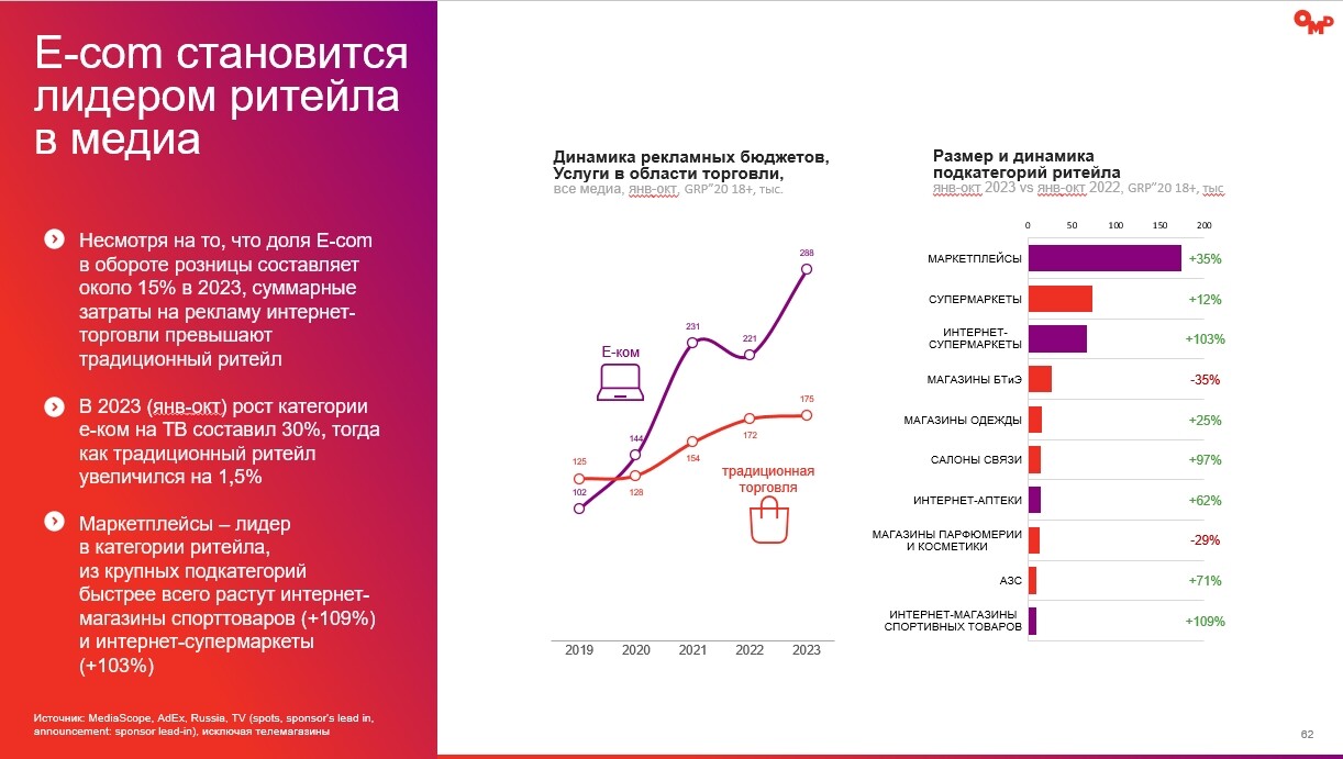 Несмотря на то, что доля e-com в обороте розницы составил около 15% в 2023г., суммарные затраты на рекламу интернет-торговли превысили традиционныйретейл. В прошлом году рост категории электронной коммерции на ТВ составил 30%,тогда как традиционный ретейл увеличился на 1,5%. Маркетплейсы стали лидером всегменте ретейла, из крупных подкатегорий быстрее всего растут интернет-магазины спорттоваров (+109%) и интернет-супермаркеты (+103%).