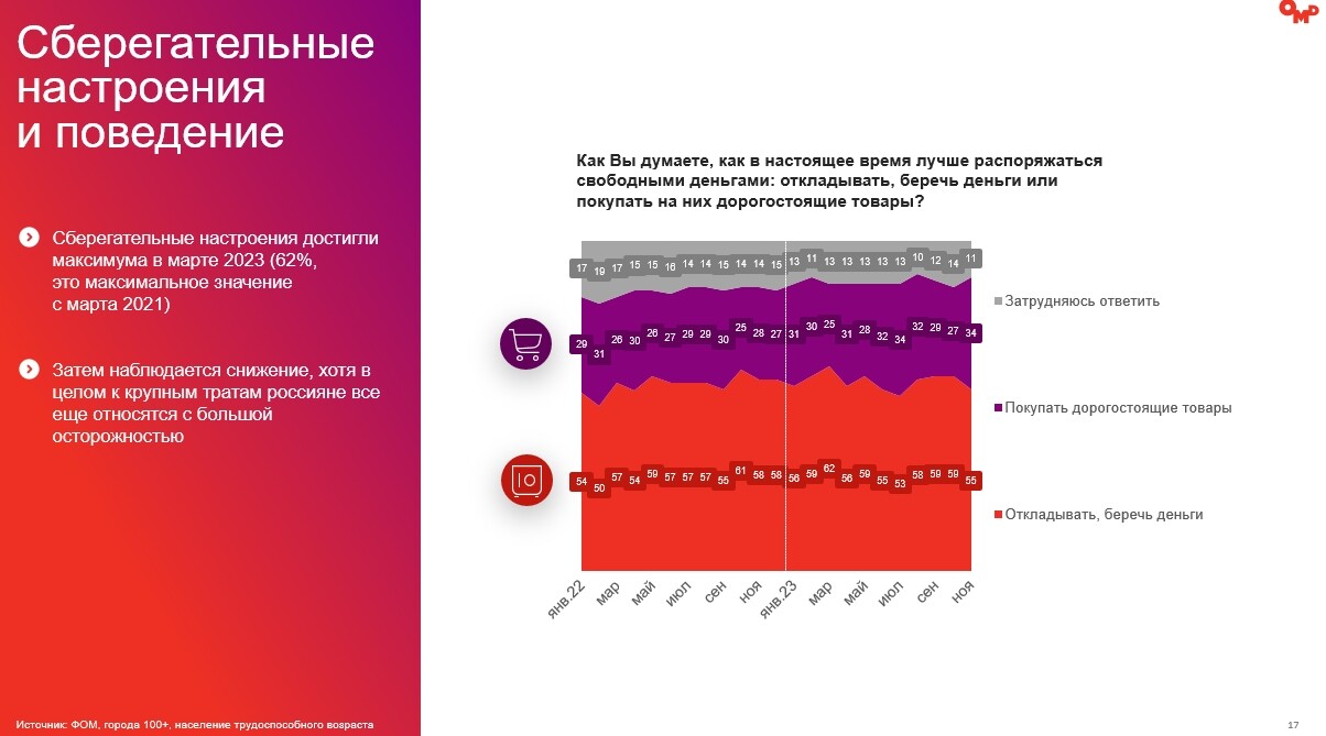 Сберегательные настроения россиян достигли максимума в марте 2023 г. — 62%.Затем наблюдалось снижение, хотя в целом к крупным тратам россияне все ещеотносятся с большой осторожностью.