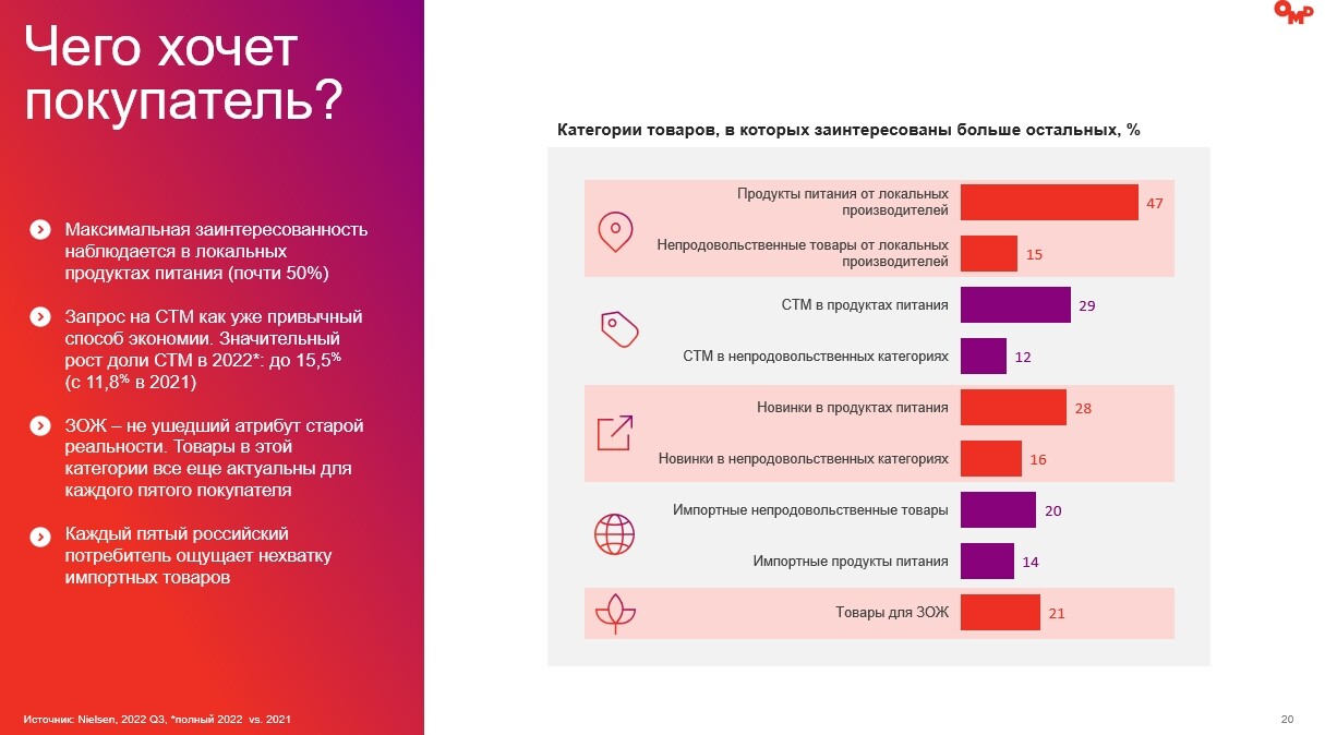 По итогам года россияне больше всего интересовались продовольственнымитоварами от локальных производителей — 47%, собственными торговыми марками(СТМ) в продуктах питания — 29% и новинками — 28%. Меньше всего потребителямбыли интересны СТМ в непродовольственных категориях — 12%, импортные продукты —14% и непродовольственные товары от локальных производителей — 15%.