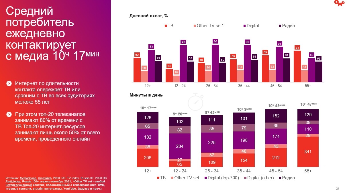 Средний потребитель ежедневно контактирует с медиа 10 часов 17 минут.Интернет по длительности контакта опережает ТВ. При этом топ-20 телеканаловзанимают 80% от времени с ТВ. Топ-20 интернет-ресурсов занимают около 50% отвсего времени, проведенного онлайн. В среднем за 2023 г. телесмотрениесократилось на 7,3% относительно 2022 г.