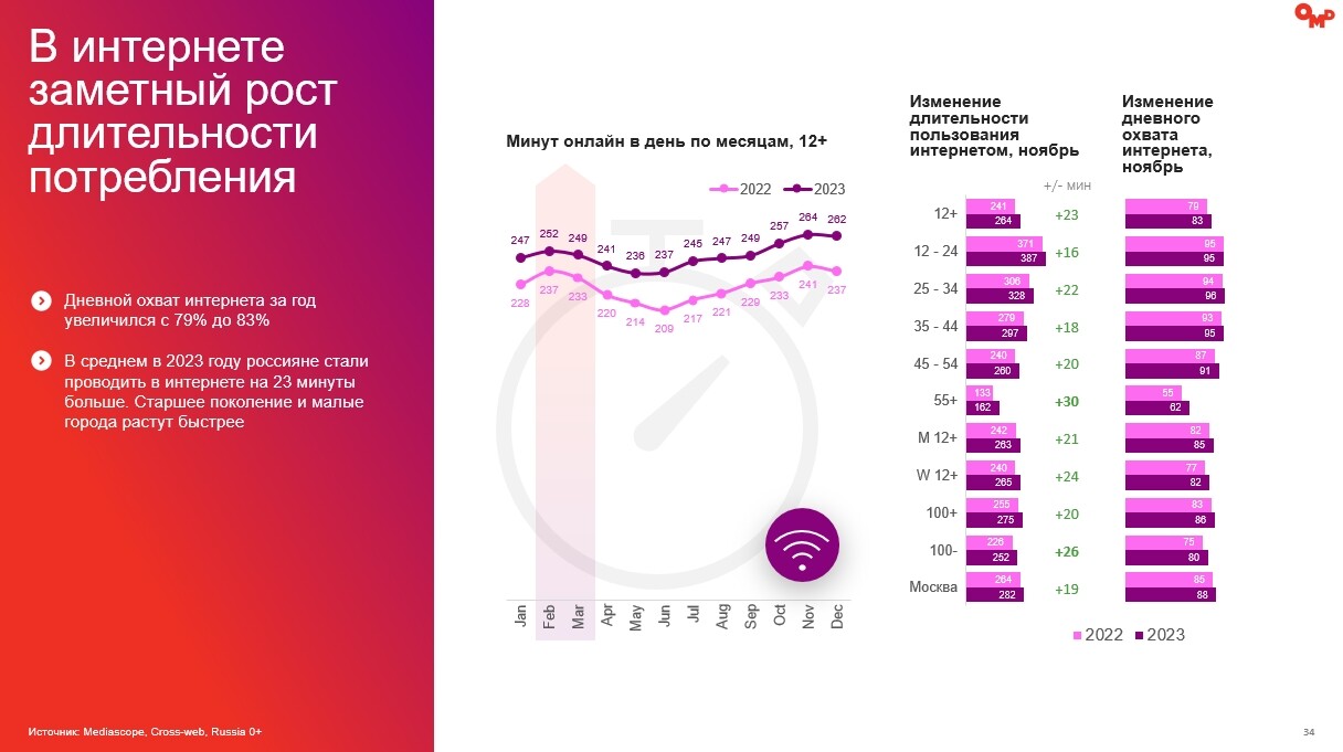 Кроме того, на потребление YouTube россияне тратят больше времени, чем налюбой телевизионный канал, — 42 минуты. На втором месте «Россия 1» — 32 минуты,на третьем НТВ — 23 минуты. Дневной охват интернета в ноябре прошлого года увеличился год к году с 79 до83% и достиг 83 минут в день. В среднем россияне стали проводить в интернете на23 минуты больше — 4,4 часа.