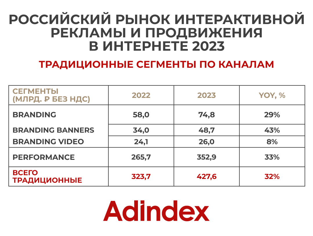 Рекламные затраты в branding video выросли на 8% и составили 26 млрд руб.Расходы в баннерную рекламу (branding banners) увеличились на 43% — до 48,7млрд руб. Сегмент performance-рекламы повысился на треть, его объем достиг352,9 млрд руб.