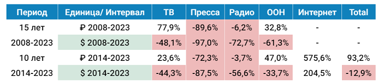 Динамика рекламных доходов в различных медиасегментахза 10 и 15 лет, ₽/$