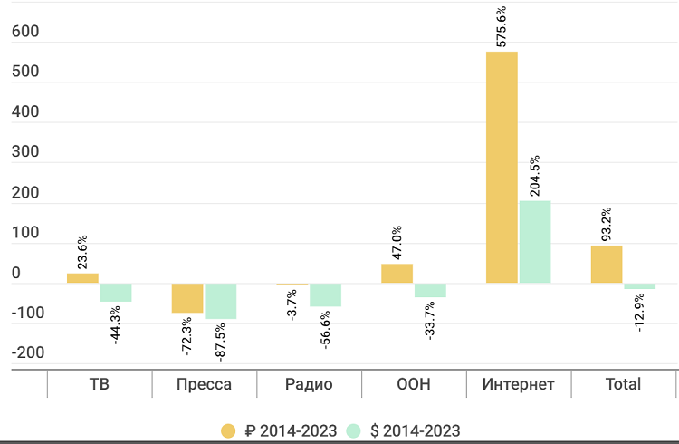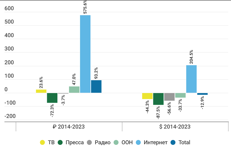 Произведенные расчеты показывают, что, несмотря на почти двукратный рост врублевом выражении, в долларах за десять лет рекламный рынок сократился на 13%.Единственным сегментом, сумевшим за этот период показать рост вдолларовом выражении, стал интернет. Сильнее всего упали доходы от рекламы нарадио и в прессе.