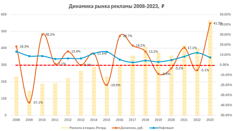 1 часть: объемы медиарекламного рынка. Динамика2008–2023 гг. и сравнение с макроэкономическими показателями.