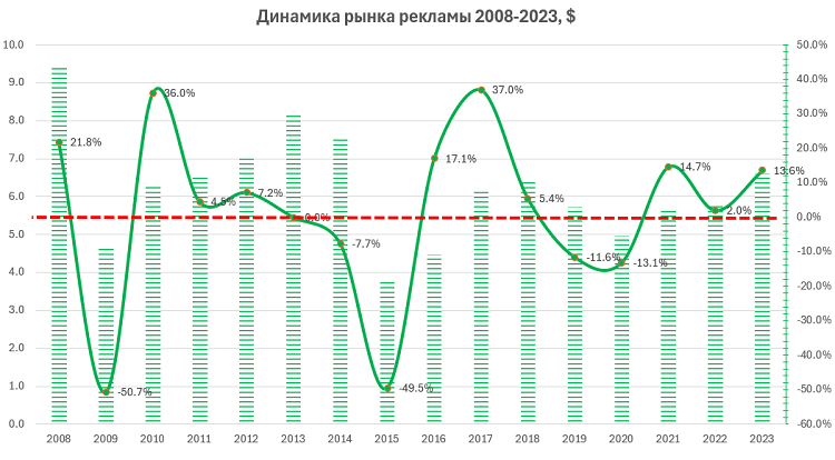 За 15 лет российский рекламный рынок вырос в рублях, но потерял в долларах, а его динамика отстает от темпов роста базовых макроэкономических показателей.