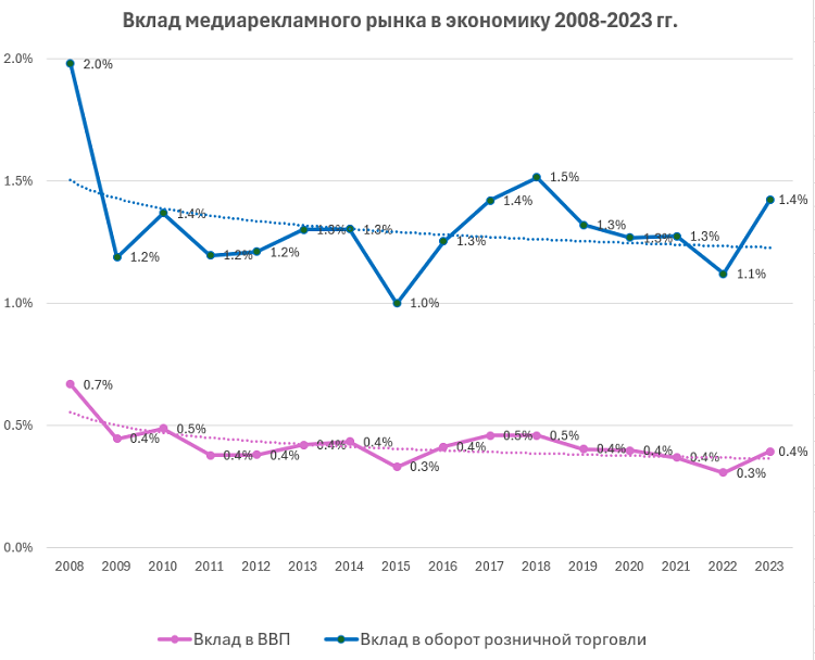 Поскольку реклама более всего востребована на рынках конечнойпотребительской продукции и услуг, то в рамках исследования было проведеносравнение стоимостных объемов этого рынка не только сВВП,но и с оборотом розничной торговли. Выяснилось, что в 2008–2023гг. темпы роста рынка рекламы составили в рублевом выражении 140%, оборотрозничной торговли за аналогичный период времени увеличился на 240%. Отношениестоимостного объема рекламного рынка к обороту розничнойторговли снизилось на 28% с почти 2 до 1,4%.