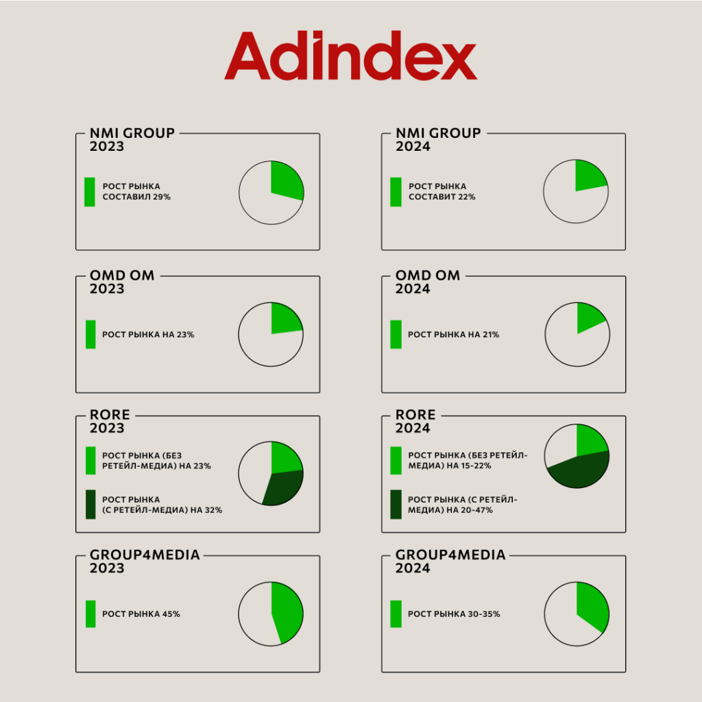 В NMi Group считают, что рост рынкасоставит 22% в этом году, «Роднаяречь» оценивает динамику без ретейл-медиа на 15–22%, ас учетом этого сегмента — на 20–47%, в Group4Mediaпрогнозируют увеличение на 30–35%.