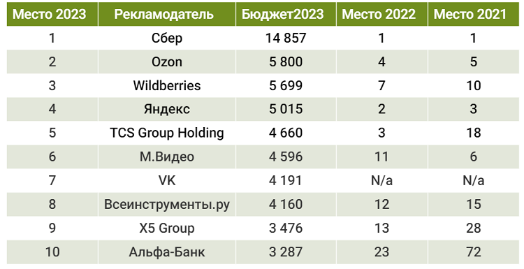 В пятерке ведущих рекламодателей три года подряд лидирует Сбер. Наращивают показатели крупные онлайн-ритейлеры Ozon и Wildberries. Примечательно, что все входящие в Топ-5 компании можно отнести к экосистемам, что подтверждает тенденцию крупных игроков к экосистемной трансформации.