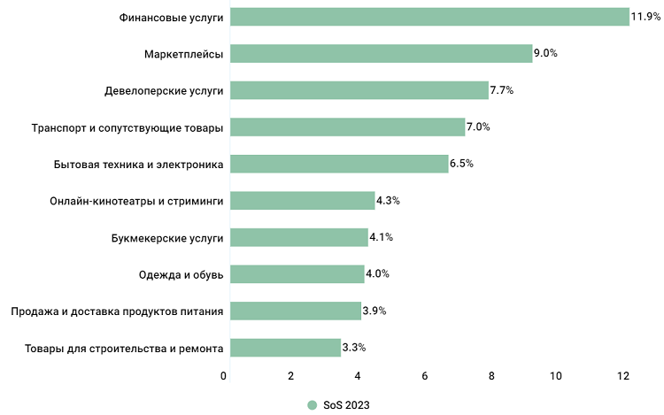 Среди категорий-драйверов рынка онлайн-рекламы, как и в 2022 г., лидируют финансовые услуги и маркетплейсы широкого профиля (Ozon, Wildberries, Alibaba Group, «Яндекс.Маркет», «СберМаркет» и т. д.)». На третьем месте девелоперские услуги. Автомобильные бренды и электроника замыкают Топ-5 по вкладу в интернет-рынок.