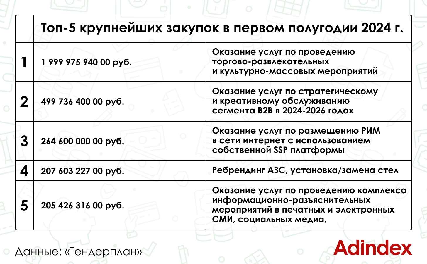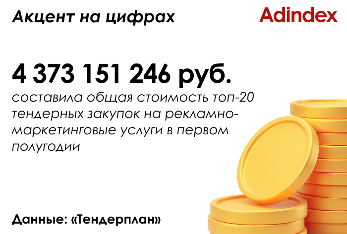 Суммарная стоимость 20 крупнейших закупок рекламно-маркетинговых услуг заянварь-июнь 2024 г. выросла более чем в два раза по сравнению с тем же периодомпрошлого года, согласно данным поисково-аналитической системы по управлениютендерами «Тендерплан» (есть в распоряжении AdIndex).