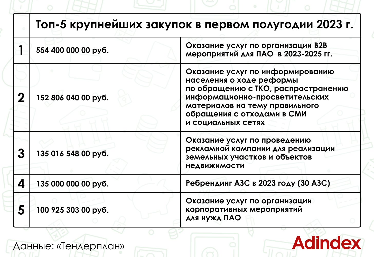 В топ-5 закупок по стоимости в первом полугодии также вошли «Оказание услугпо стратегическому и креативному обслуживанию сегмента В2В в 2024-2026 гг.» на499,7 млн руб., «Оказание услуг по размещению РИМ в сети интернет сиспользованием собственной SSP платформы» — 264,6 млн руб. Организации такжеискали подрядчиков для ребрендинга АЗС, установку и замену стел — 207,6 млнруб. и для услуг для проведения информационно-разъяснительных мероприятий вразных каналах об услугах, предоставляемых Фондом пенсионного и социальногострахования — 205,4 млн руб.