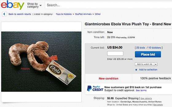 Как и следовало ожидать, eBay под завязку забит тематическими товарами от костюмов для Хэллоуина и настоящей защитной одежды до плюшевых игрушек и книг вроде «Жизнь с Эболой: Как я научился не волноваться и любить свой вирус». Номерные знаки 1999 года продаются по $100. Также на сайте доступны стикеры Ebola Inside, напоминающие фирменный знак Intel.
