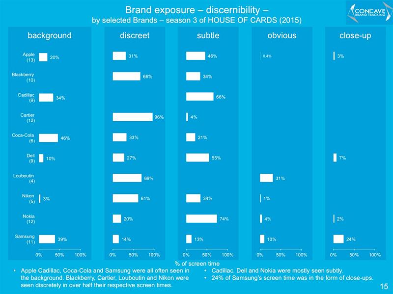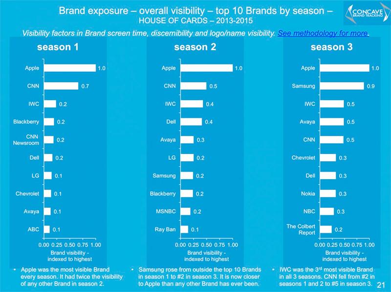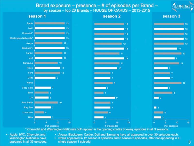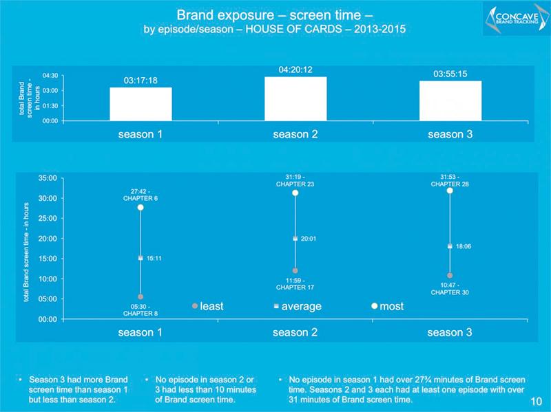 Давайте теперь посмотрим, как долго вы могли видеть эти бренды на экране? Согласно данным Concave, скрытая реклама занимает около 4 часов третьего сезона. Но все-таки это меньше, чем в первом и втором сезонах.