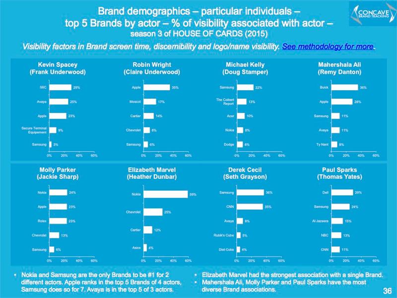 Клэр Андервуд (Робин Райт) чаще все пользуется iPhone, Реми Дентон (Махершалалхашбаз Али) ездит на «Бюике», Фрэнк Андервуд (Кевин Спейси) всегда носит часы IWC.
