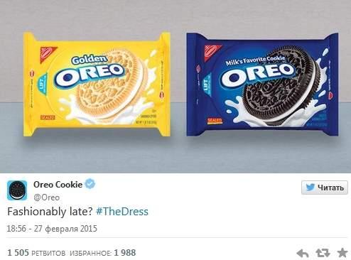 Не отставали и компании, специализирующиеся на производстве и торговле продуктами питания. Например, печенье Oreo представило пачки обоих расцветок и пошутило, что тренд подхвачен поздно.