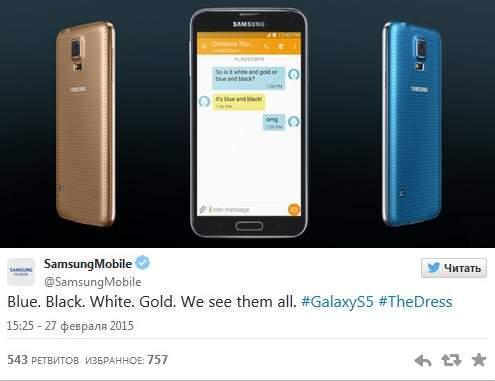 Снимок быстро стал популярным, в комментариях развернулась горячая дискуссия, которую поддержал портал BuzzFeed, задавший вопрос о цвете платья своим читателям. Пользователи 'Твиттера' присоединились к обсуждениям, и у дискуссий о цвете платья появился собственный хэштег #TheDress, возглавивший топ трендов в США.