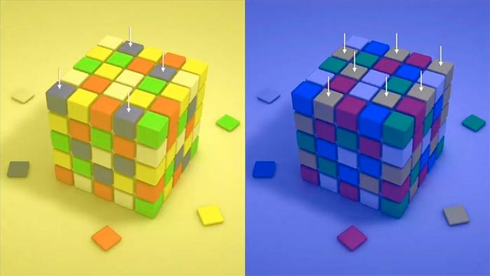 Квадратики на этих кубиках Рубика, тоже одинаково-серые, несмотря на то, что кажутся желтыми и синими.