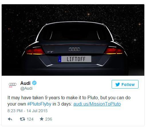 Audi выпустила спецпроект, в котором предложила отправиться в путешествие к Плутону. Правда, в данном случае Плутон оказался рестораном около Лос-Анджелеса. Маршрут пролегал через несколько городов США, где находятся рестораны и музеи с названиями, похожими на имена планет.
