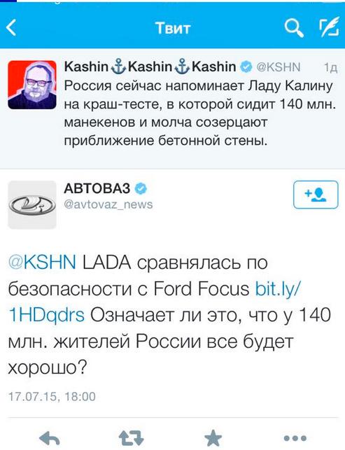 В своем Twitter Олег Кашин разместил сообщение, в котором сравнил Россию с автомобилем Lada Kalina. На что получил оригинальный ответ от аккаунта @avtovaz_news. Выглядит это довольно неожиданно, потому что обычно в @avtovaz_news публикуются стандартные новости автопроизводителя (о машинах, заводах) и ссылки на проект Ladalike.