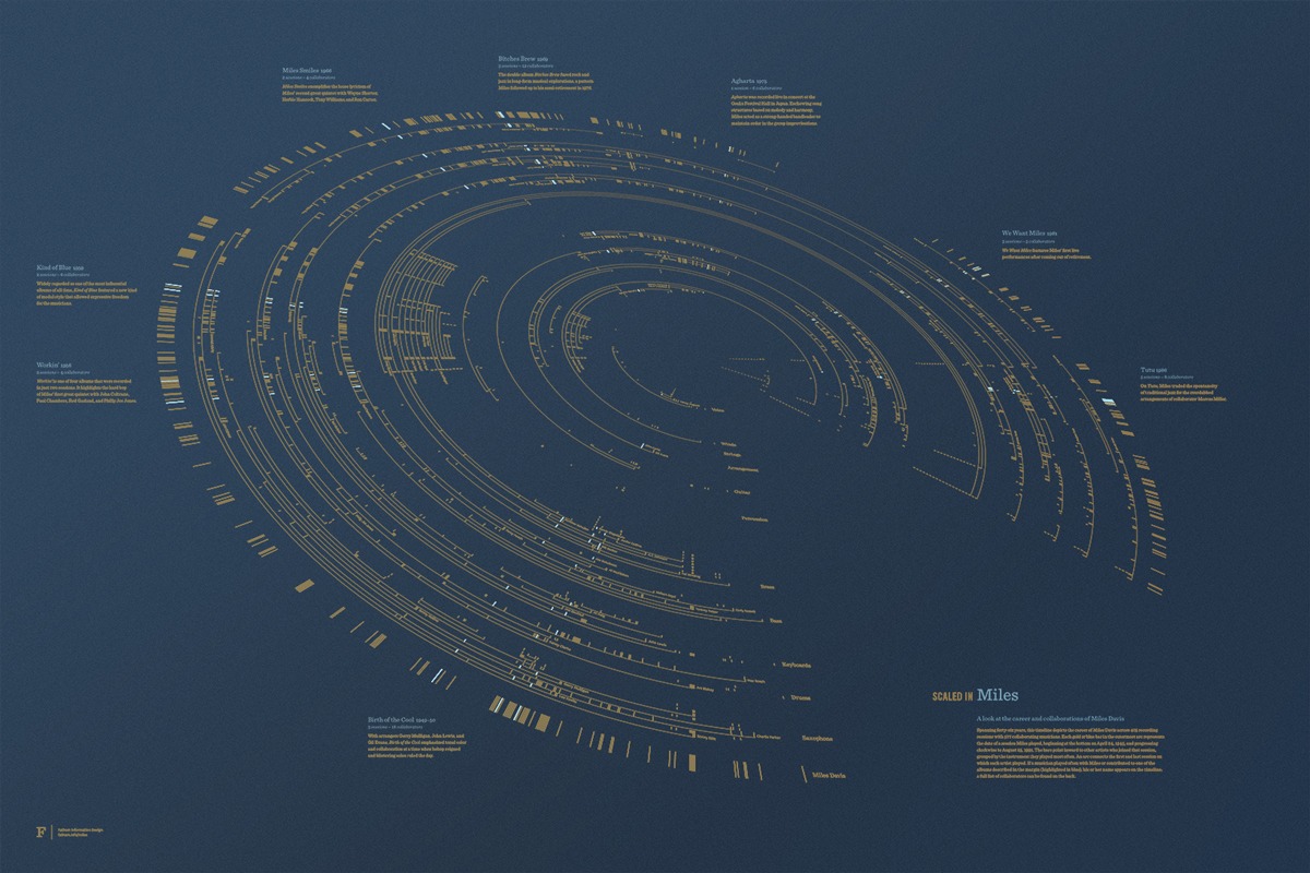 Не так уж и много есть джазменов, чье влияние было бы больше, чем у Майлза Дэвиса. Еще меньше были более плодовиты, чем он. Чтобы рассказать о том влиянии, какое музыка Дэвиса оказала на джаз, эта визуализация была сделана в форме созвездия. В нем представлены все аспекты творчества музыканта – от скорости создания произведений и перемен в стиле игры до коллег, работавших с Дэвисом в разные годы.