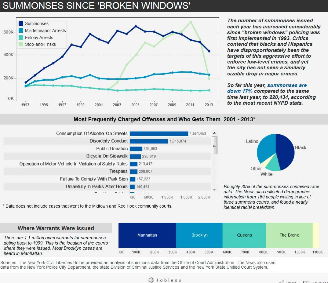 В прошлом году в Нью-Йорке действовала программа «Разбитые окна», в рамках которой людей штрафовали за незначительные нарушения правопорядка. Выяснилось, что чаще всего нападкам со стороны полиции подвергались афроамериканцы и латиноамериканцы. Чтобы пролить свет на проблему и заодно подколоть полицейских за неэффективность программы, New York Daily News придумала Tableau. Это визуализация данных, собранных в ходе 169 интервью с людьми, на которых город подал в суд. В результате городские власти вынуждены были пересмотреть свои подходы к наведению порядка в Нью-Йорке.