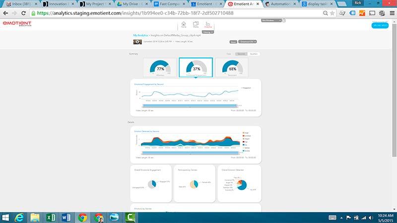 Сосредоточение на самых тонких нюансах потребительского опыта для многих является ключом к успеху. Но в чем заключается ваш научный подход? Emotient использует потребительские видеозаписи, таким образом позволяя компаниям видеть живую реакцию своих клиентов в реальном времени. Во-первых, приложение хранит карту «микровыражений», появляющихся на лицах людей. Во-вторых, Emotient может суммировать полученную информацию и выдавать ее в виде простых графиков. Так что компании в любой момент могут узнать о том, что именно думают и чувствуют их покупатели.