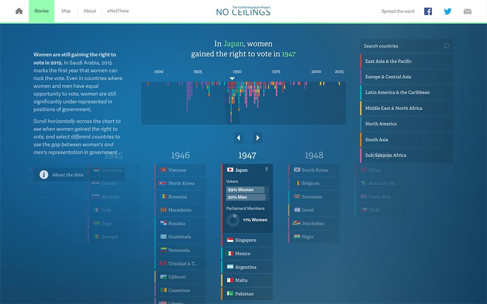Довольно сложно доказать существование гендерного неравенства, и поэтому Fathom Information Design создала портал No Ceilings (Без потолков). Он аккумулировал порядка 850 тысяч единиц данных со всего мира и превратил их в наглядную картину того, как ущемляются права женщин в разных частях света.