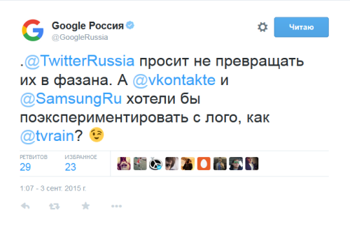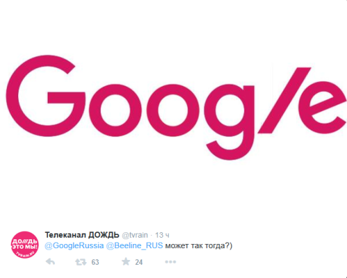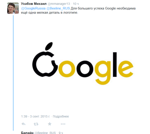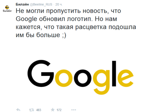 «Не могли пропустить новость, что Google обновил логотип. Но нам кажется, что такая расцветка подошла им бы больше ;)», - написал «Билайн» в своем официальном аккаунте в Twitter.